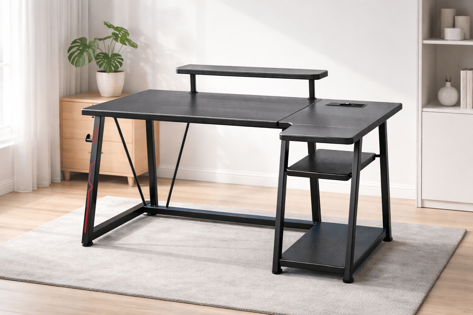 Include un vassoio per tastiera estraibile con capacità di carico fino a 10 kg, 2 ganci laterali per cuffie e un foro passacavi per una gestione ordinata dei cavi.